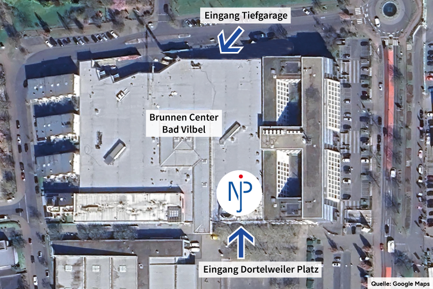 Willy-Brandt-Straße, Bad Vilbel-Dortelweil. Halten Sie sich in der Tiefgarage ganz hinten links und nutzen Sie anschließend den Aufgang 2A.